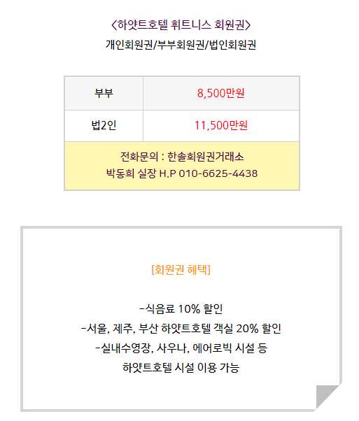 하얏트호텔의 회원권은 개인회원권, 부부회원권, 법인회원권으로