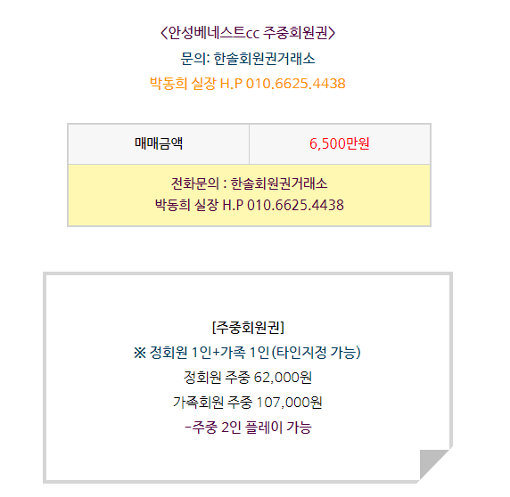 안성베네스트cc 회원권은 주중회원권으로 정회원 1인과