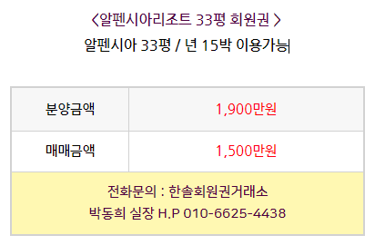 평창 알펜시아리조트 33평 회원권의 매매시세와 혜택 등에