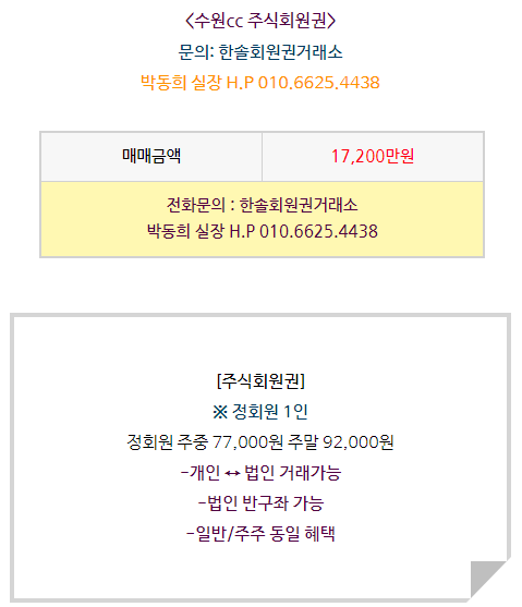 수원cc 회원권은 주식회원권으로 정회원 1인