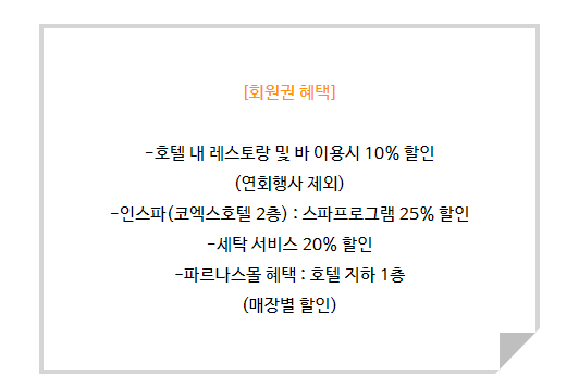 파르나스몰 혜택 : 호텔 지하 1층 매장별 할인 등등의 혜택을 보유하고 있습니다.