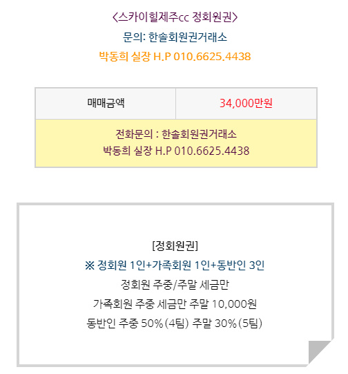스카이힐제주cc 회원권은 정회원권으로 정회원 1인,
