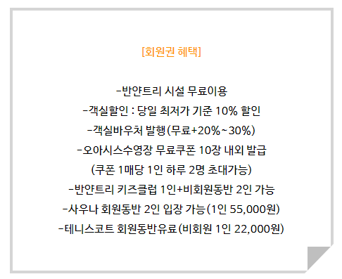 객실할인, 객실바우처 발행, 오아시스 수영장 무료쿠폰 발행, 사우나, 테니스