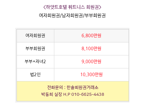 하얏트호텔휘트니스회원권 시세 및 혜택안내