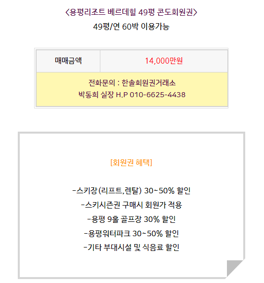 용평리조트 베르데힐콘도 49평 회원권은 연 60박