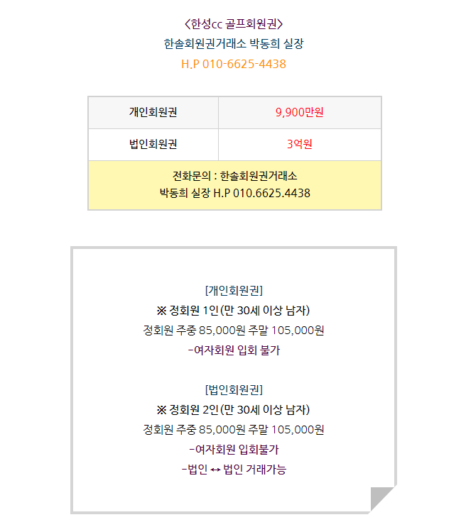 한성cc 회원권은 개인회원권, 법인회원권으로