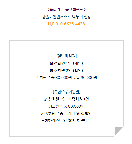 골프회원권/플라자-용인 용인플라자cc회원권 매매안내 한솔회원권거래소 작성함 2021. 12. 13. 14:46 페이스북에 공유 카카오스토리에 공유 네이버에 공유 트위터에 공유 구글플러스에 공유 + 안녕하세요. 한솔회원권거래소 박동희 실장입니다. 오늘은 용인플라자cc회원권에 대해서 알아보도록 하겠습니다. 매매상담 - 한솔회원권거래소 박동희 실장 010.6625.4438 용인플라자cc회원권은 일반회원권과 복합주중회원권으로 구분되어 있습니다. 회원권에 대해서 더욱 궁금하신 부분이나 기타 문의사항은 한솔회원권으로 부탁드립니다. ▼▼▼ 플라자cc 이용요금 및 예약안내 플라자cc 오시는 길 골프/콘도/휘트니스 회원권 한솔회원권거래소 빠른상담을 원하신다면 아래의 이미지를 클릭하여 주시기 바랍니다. ▼▼▼ 공유하기 게시글 관리 한솔회원권거래소 저작자표시 (새창열림) '골프회원권/플라자-용인' 다른 게시물 보기 더보기 2022.05.02 용인플라자cc회원권 매매 안내드립니다. 2022.04.29 용인플라자cc회원권 매매 안내 2021.11.22 용인플라자cc회원권 매매안내 2021.04.23 플라자cc 골프회원권 혜택과 정보