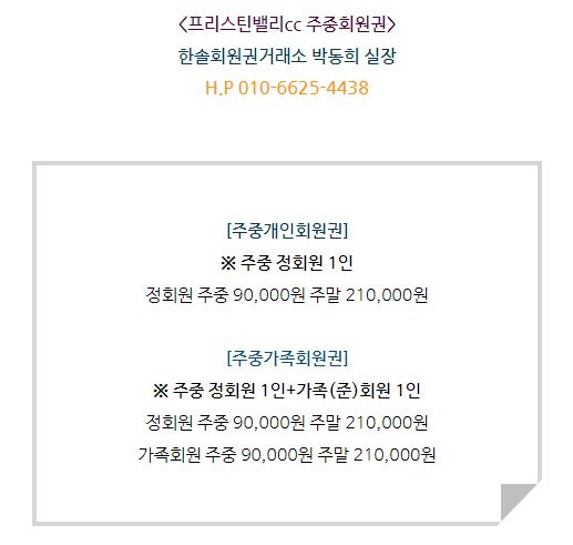 골프회원권/프리스틴밸리 프리스틴밸리cc회원권 매매안내 드립니다. 한솔회원권거래소 작성함 2021. 12. 14. 13:38 페이스북에 공유 카카오스토리에 공유 네이버에 공유 트위터에 공유 구글플러스에 공유 + 안녕하세요. 한솔회원권거래소 박동희 실장입니다. 오늘은 프리스틴밸리cc회원권에 대해서 알아보도록 하겠습니다. 매매상담 - 한솔회원권거래소 박동희 실장 010.6625.4438 프리스틴밸리cc회원권은 주중개인과 주중가족으로 구분되어 있습니다. 더욱 궁금하신 부분이나 기타 문의사항이 있다면 한솔회원권으로 문의 부탁드립니다. ▼▼▼ 프리스틴밸리cc 이용요금 및 예약안내 프리스틴밸리cc 오시는 길 골프/콘도/휘트니스 회원권 한솔회원권거래소 빠른상담을 원하신다면 아래의 이미지를 클릭하여 주시기 바랍니다. ▼▼▼ 공유하기 게시글 관리 한솔회원권거래소 저작자표시 (새창열림) '골프회원권/프리스틴밸리' 다른 게시물 보기 더보기 2022.03.16 프리스틴밸리cc회원권 매매 안내드립니다. 2022.02.10 프리스틴밸리cc회원권 매매 안내드립니다. 2021.11.17 프리스틴밸리cc회원권 매매안내 2021.08.25 프리스틴밸리cc골프회원권 2021.08.25 안내
