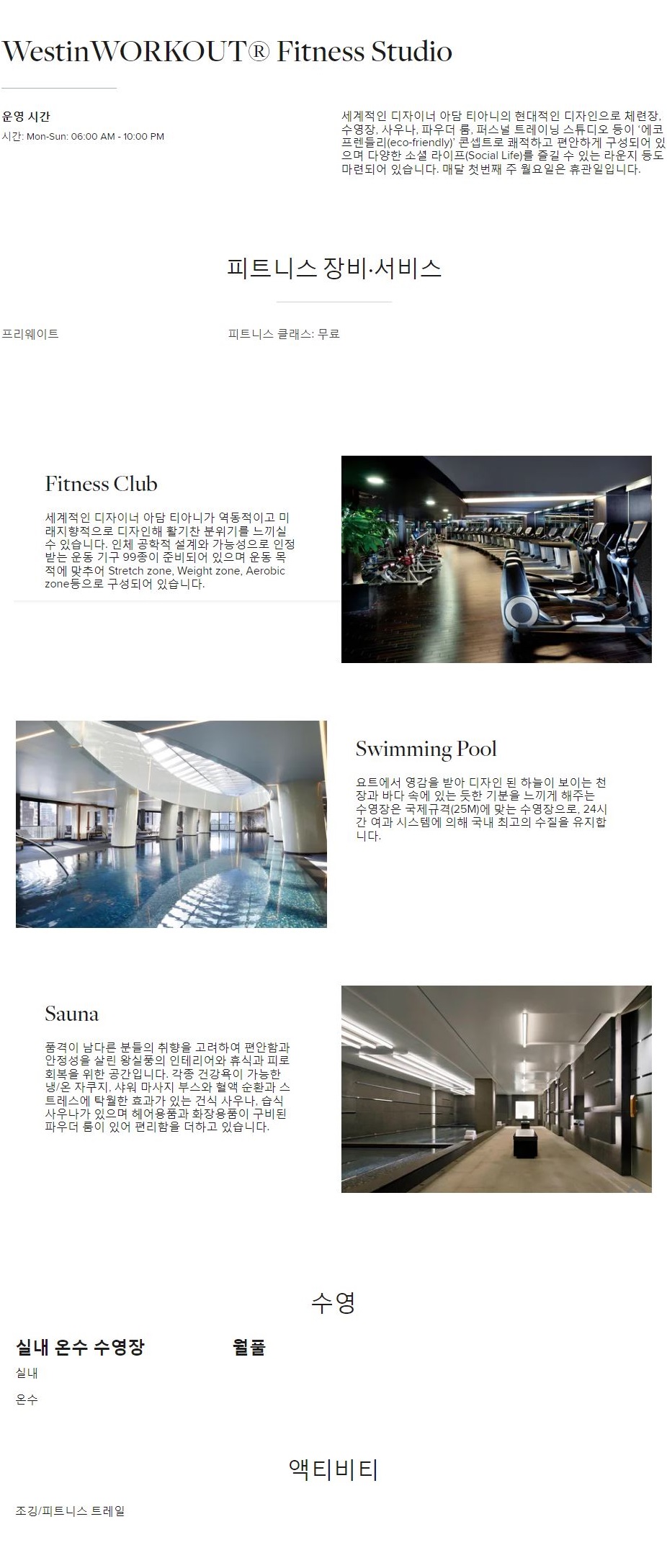 주요시설 : 체련장, 실내 수영장, 에어로빅스튜디오, 사우나, 스파 등