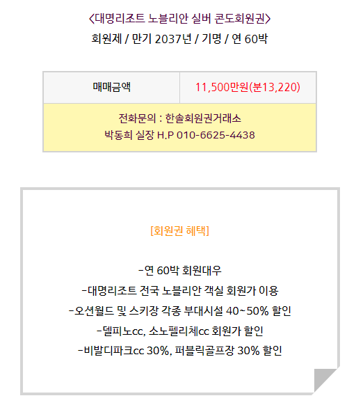 대명리조트 노블리안 실버회원권 매매 안내드립니다.