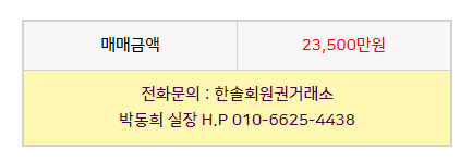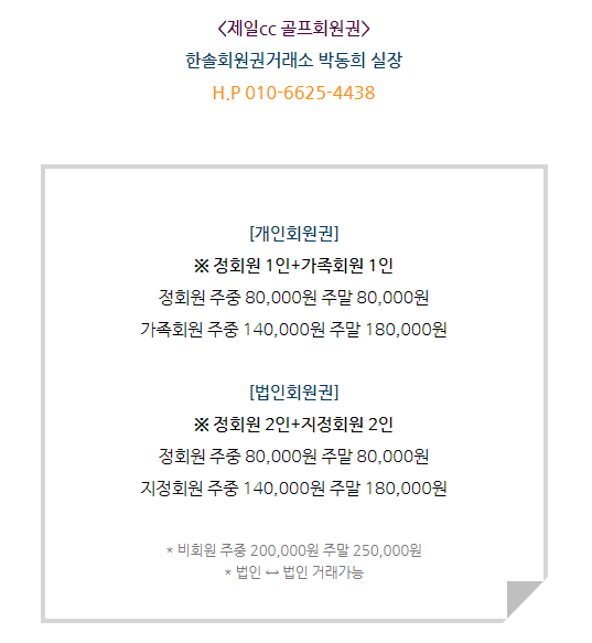 골프회원권/제일 제일cc회원권 매매 안내드립니다. 한솔회원권거래소 작성함 2022. 1. 3. 13:23 페이스북에 공유 카카오스토리에 공유 네이버에 공유 트위터에 공유 구글플러스에 공유 + 안녕하세요. 한솔회원권거래소 박동희 실장입니다. 오늘은 제일cc회원권에 대해서 알아보도록 하겠습니다. 매매상담 - 한솔회원권거래소 박동희 실장 010.6625.4438 제일cc회원권은 개인회원권과 법인회원권으로 구분되어 있습니다. 법인과 법인간의 거래가 가능한 회원권입니다. 더욱 궁금하신 부분이 있다면 한솔회원권으로 문의하여 주시기 바랍니다. ▼▼▼ 제일cc 이용요금 안내 제일cc 오시는 길 골프/콘도/휘트니스 회원권 한솔회원권거래소 빠른상담을 원하신다면 아래의 이미지를 클릭하여 주시기 바랍니다. ▼▼▼ 공유하기 게시글 관리 한솔회원권거래소 저작자표시 (새창열림) '골프회원권/제일' 다른 게시물 보기 더보기 2022.03.18 제일cc회원권 매매 안내드립니다. 2022.02.08 제일cc회원권 매매 안내드립니다. 2021.11.01 제일cc회원권 매매안내 2021.04.21 제일cc 골프회원권 혜택과 정보