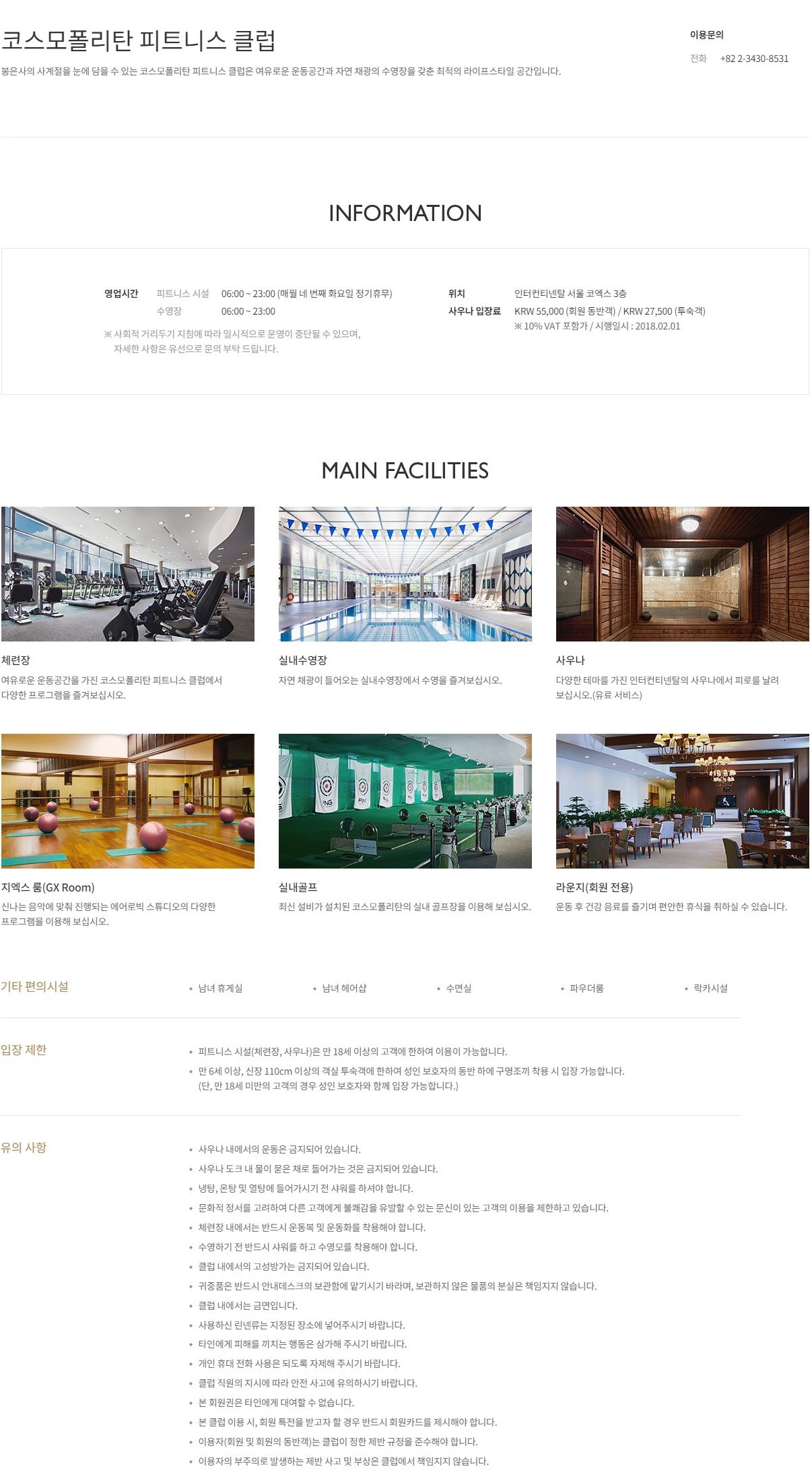 주요시설 : 체련장, 실내 수영장, 사우나, GX룸, 실내골프장, 라운지 등
