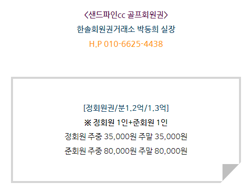 골프회원권/샌드파인 샌드파인cc회원권 매매 안내드립니다. 한솔회원권거래소 작성함 2022. 1. 6. 13:07 페이스북에 공유 카카오스토리에 공유 네이버에 공유 트위터에 공유 구글플러스에 공유 + 안녕하세요. 한솔회원권거래소 박동희 실장입니다. 오늘은 샌드파인cc회원권에 대해서 알아보도록 하겠습니다. 매매상담 - 한솔회원권거래소 박동희 실장 010.6625.4438 샌드파인cc회원권은 정회원권과 법인회원권으로 구분되어 있습니다. 더욱 궁금하신 부분이 있다면 한솔회원권으로 문의하여 주시기 바랍니다.^^ ▼▼▼ 샌드파인cc 이용요금 및 예약안내 샌드파인cc 오시는 길 골프/콘도/휘트니스 회원권 한솔회원권거래소 빠른상담을 원하신다면 아래의 이미지를 클릭하여 주시기 바랍니다. ▼▼▼ 공유하기 게시글 관리 한솔회원권거래소 저작자표시 (새창열림) '골프회원권/샌드파인' 다른 게시물 보기 더보기 2022.07.14 샌드파인cc회원권 매매 안내드립니다. 2021.02.04 샌드파인cc회원권 혜택과 정보 안내 2020.12.18 샌드파인cc회원권 혜택과 정보