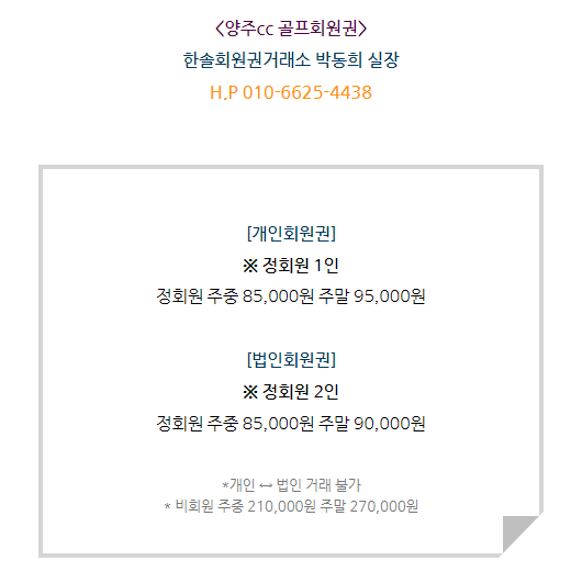 골프회원권/양주 양주cc회원권 매매 안내드립니다. 한솔회원권거래소 작성함 2022. 1. 7. 13:37 페이스북에 공유 카카오스토리에 공유 네이버에 공유 트위터에 공유 구글플러스에 공유 + 안녕하세요. 한솔회원권거래소 박동희 실장입니다. 오늘은 양주cc회원권에 대해서 알아보도록 하겠습니다. 매매상담 - 한솔회원권거래소 박동희 실장 010.6625.4438 양주cc회원권은 개인회원권과 법인회원권으로 구분되어 있습니다. 개인과 법인간의 거래가 불가능한 회원권으로 더욱 궁금하신 부분이 있다면 한솔회원권으로 문의하여 주시기 바랍니다. ▼▼▼ 양주cc 이용요금 및 예약안내 양주cc 오시는 길 골프/콘도/휘트니스 회원권 한솔회원권거래소 빠른상담을 원하신다면 아래의 이미지를 클릭하여 주시기 바랍니다. ▼▼▼ 공유하기 게시글 관리 한솔회원권거래소 저작자표시 (새창열림) '골프회원권/양주' 다른 게시물 보기 더보기 2022.03.29 양주cc회원권 매매 안내드립니다. 2022.02.15 양주cc회원권 매매 안내드립니다. 2021.12.06 양주cc회원권 매매안내 2021.09.24 양주cc회원권 시세 & 혜택안내
