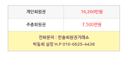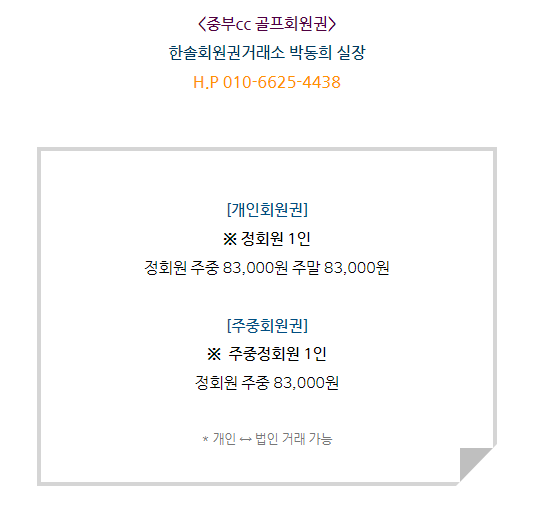 골프회원권/중부 중부cc회원권 매매 안내드립니다. 한솔회원권거래소 작성함 2022. 1. 17. 13:10 페이스북에 공유 카카오스토리에 공유 네이버에 공유 트위터에 공유 구글플러스에 공유 + 안녕하세요. 한솔회원권거래소 박동희 실장입니다. 오늘은 중부cc회원권에 대해서 알아보도록 하겠습니다. 매매상담 - 한솔회원권거래소 박동희 실장 010.6625.4438 중부cc회원권은 개인회원권과 주중회원권으로 구분되어 있습니다. 두 회원권 모두 정회원 1인 입회로 구성되어 있으며 더욱 궁금하신 부분이 있다면 한솔회원권으로 문의 부탁드립니다. ▼▼▼ 중부cc 이용요금 및 예약안내 중부cc 오시는 길 골프/콘도/휘트니스 회원권 한솔회원권거래소 빠른상담을 원하신다면 아래의 이미지를 클릭하여 주시기 바랍니다. ▼▼▼ 공유하기 게시글 관리 한솔회원권거래소 저작자표시 (새창열림) '골프회원권/중부' 다른 게시물 보기 더보기 2022.04.15 중부cc회원권 매매 안내드립니다. 2022.04.06 중부cc회원권 매매 안내드립니다. 2021.11.03 중부cc회원권 매매안내 2021.10.19 2021.10.19 중부cc 회원권 시세 및 혜택안내