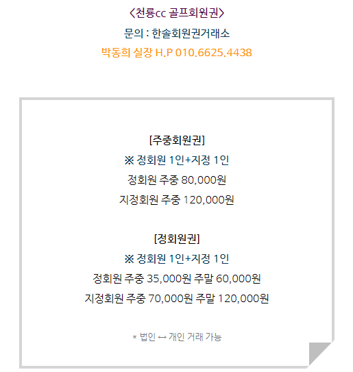 골프회원권/천룡 천룡cc회원권 시세 알아보기! 한솔회원권거래소 작성함 2022. 2. 8. 15:15 페이스북에 공유 카카오스토리에 공유 네이버에 공유 트위터에 공유 구글플러스에 공유 + 안녕하세요. 한솔회원권거래소 박동희 실장입니다. 오늘은 천룡cc회원권에 대해서 알아보도록 하겠습니다. 매매상담 - 한솔회원권거래소 박동희 실장 010.6625.4438 천룡cc회원권은 주중회원권과 정회원권으로 구분되어 있습니다. 개인과 법인간의 거래가 가능한 회원권으로 더욱 궁금하신 부분이 있다면 한솔회원권으로 문의하여 주시기 바랍니다. ▼▼▼ 천룡cc 이용요금 및 예약안내 천룡cc 오시는 길 골프/콘도/휘트니스 회원권 한솔회원권거래소 빠른상담을 원하신다면 아래의 이미지를 클릭하여 주시기 바랍니다. ▼▼▼ 공유하기 게시글 관리 한솔회원권거래소 저작자표시 (새창열림) '골프회원권/천룡' 다른 게시물 보기 더보기 2022.07.11 천룡cc회원권 매매 안내드립니다. 2021.12.15 천룡cc회원권 매매 안내드립니다. 2021.09.25 천룡cc 골프회원권 주중회원권 추천매물 매매시세 (2021.09.25.) 안내 _ 천룡cc회원권 천룡cc주중 천룡컨트리클럽 2021.09.23 천룡cc골프회원권 혜택안내