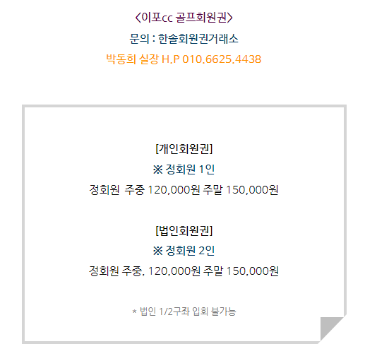 골프회원권/이포 이포cc회원권 매매 안내 드립니다. 한솔회원권거래소 작성함 2022. 2. 17. 13:50 페이스북에 공유 카카오스토리에 공유 네이버에 공유 트위터에 공유 구글플러스에 공유 + 안녕하세요. 한솔회원권거래소 박동희 실장입니다. 오늘은 이포cc회원권에 대해서 알아보도록 하겠습니다. 매매상담 - 한솔회원권거래소 박동희 실장 010.6625.4438 이포cc회원권은 개인회원권과 법인회원권으로 구분되어 있습니다. 법인 입회시 1/2구좌 입회는 불가능한 점 참고하여 주시기 바라며 더욱 궁금하신 부분은 한솔회원권으로 문의 부탁드립니다. ▼▼▼ 이포cc 이용요금 및 예약안내 이포cc 오시는 길 골프/콘도/휘트니스 회원권 한솔회원권거래소 빠른상담을 원하신다면 아래의 이미지를 클릭하여 주시기 바랍니다. ▼▼▼ 공유하기 게시글 관리 한솔회원권거래소 저작자표시 (새창열림) '골프회원권/이포' 다른 게시물 보기 더보기 2022.05.26 이포cc회원권 매매 안내드립니다. 2022.04.07 이포cc회원권 매매 안내드립니다. 2022.01.24 이포cc회원권 매매 안내드립니다. 2021.11.16 이포cc회원권 매매안내