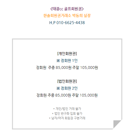 골프회원권/태광 태광cc회원권 매매 안내드립니다. 한솔회원권거래소 작성함 2022. 2. 24. 14:07 페이스북에 공유 카카오스토리에 공유 네이버에 공유 트위터에 공유 구글플러스에 공유 + 안녕하세요. 한솔회원권거래소 박동희 실장입니다. 오늘은 태광cc회원권에 대해서 알아보도록 하겠습니다. 매매상담 - 한솔회원권거래소 박동희 실장 010.6625.4438 태광cc회원권은 개인회원권과 법인회원권으로 구분되어 있습니다. 개인과 법인간의 거래, 법인 반구좌 입회가 불가능하며 남자와 여자회원권을 구분거래 하고 있는 점 참고하여 주시기 바랍니다. ▼▼▼ 태광cc 이용요금 및 예약안내 태광cc 오시는 길 골프/콘도/휘트니스 회원권 한솔회원권거래소 빠른상담을 원하신다면 아래의 이미지를 클릭하여 주시기 바랍니다. ▼▼▼ 공유하기 게시글 관리 한솔회원권거래소 저작자표시 (새창열림) '골프회원권/태광' 다른 게시물 보기 더보기 2022.05.04 태광cc회원권 매매 안내드립니다. 2022.04.01 태광cc회원권 매매 안내드립니다. 2021.12.29 태광cc회원권 매매 안내드립니다. 2021.11.08 태광cc회원권 매매안내
