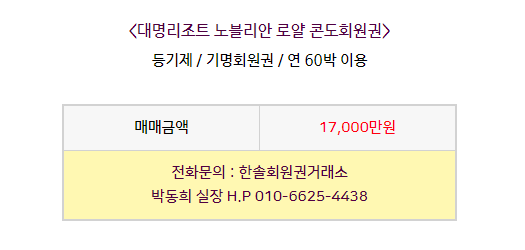 콘도회원권/대명노블리안 대명리조트 노블리안 로얄 콘도회원권 매매 안내드립니다. 한솔회원권거래소 작성함 2022. 3. 7. 16:48 페이스북에 공유 카카오스토리에 공유 네이버에 공유 트위터에 공유 구글플러스에 공유 + 안녕하세요. 한솔회원권거래소 박동희 실장입니다. 오늘은 노블리안 로얄 콘도회원권에 대해서 알아보도록 하겠습니다. 매매상담 - 한솔회원권거래소 박동희 실장 010.6625.4438 골프/콘도/휘트니스 회원권 한솔회원권거래소 아래의 이미지를 클릭하여 주시면 빠르고 정확한 상담이 가능합니다. ▼▼▼ 공유하기 게시글 관리 한솔회원권거래소 저작자표시 (새창열림) '콘도회원권/대명노블리안' 다른 게시물 보기 더보기 2022.04.07 대명리조트 노블리안 골드 회원권 매매 안내드립니다. 2022.03.24 대명리조트 노블리안 골드 콘도회원권 매매 안내드립니다. 2022.02.18 대명리조트 노블리안 골드 콘도회원권 매매 안내드립니다. 2022.02.07 대명리조트 노블리안 실버 회원권 시세 안내