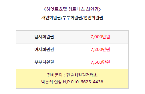 휘트니스/하얏트 하얏트호텔휘트니스회원권 매매 안내드립니다. 한솔회원권거래소 작성함 2022. 3. 15. 16:44 페이스북에 공유 카카오스토리에 공유 네이버에 공유 트위터에 공유 구글플러스에 공유 + 안녕하세요. 한솔회원권거래소 박동희 실장입니다. 오늘은 하얏트호텔휘트니스회원권에 대해 알아보도록 하겠습니다. 매매상담 - 한솔회원권거래소 박동희 실장 010.6625.4438 하얏트호텔휘트니스회원권은 개인, 부부, 법인회원권으로 구분되어 있습니다. 회원권의 종류에 따라서 시세가 달라지기 때문에 더욱 궁금하신 부분이 있다면 한솔회원권으로 문의 부탁드립니다. ▼▼▼ 골프/콘도/휘트니스 회원권 한솔회원권거래소 빠른상담을 원하신다면 아래의 이미지를 클릭하여 주시기 바랍니다. ▼▼▼ 공유하기 게시글 관리 한솔회원권거래소 저작자표시 (새창열림) '휘트니스/하얏트' 다른 게시물 보기 더보기 2022.04.26 하얏트호텔회원권 매매 안내드립니다. 2022.03.30 하얏트호텔휘트니스회원권 매매 안내드립니다. 2022.03.03 하얏트호텔 휘트니스 회원권 매매 안내드립니다. 2022.01.04 하얏트호텔휘트니스회원권 매매 안내