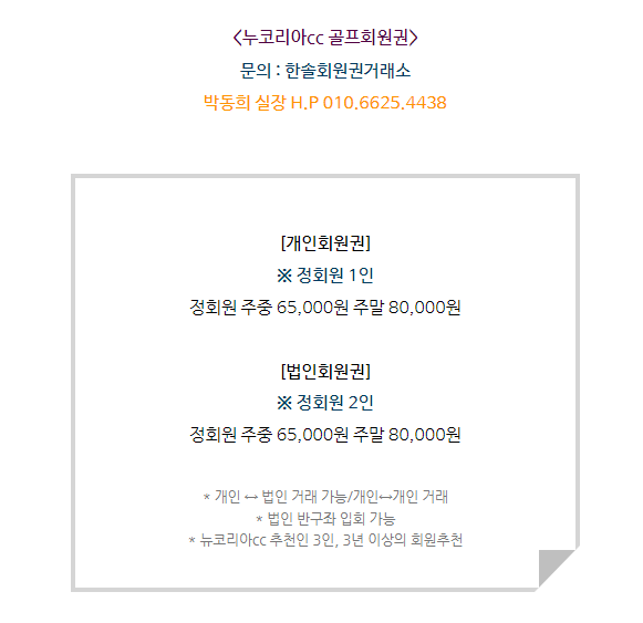 골프회원권/뉴코리아 뉴코리아cc회원권 매매 안내드립니다. 한솔회원권거래소 작성함 2022. 3. 18. 14:26 페이스북에 공유 카카오스토리에 공유 네이버에 공유 트위터에 공유 구글플러스에 공유 + 안녕하세요. 한솔회원권거래소 박동희 실장입니다. 오늘은 뉴코리아cc회원권에 대해서 알아보도록 하겠습니다. 매매상담 - 한솔회원권거래소 박동희 실장 010.6625.4438 뉴코리아cc회원권은 개인회원권과 법인회원권으로 구분되어 있습니다. 남자와 여자회원권이 구분되어 거래되는 특징을 가지고 있습니다. 더욱 궁금하신 부분은 한솔회원권으로 문의 부탁드려요. ▼▼▼ 뉴코리아cc 이용요금 및 예약안내 뉴코리아cc 오시는 길 골프/콘도/휘트니스 회원권 한솔회원권거래소 빠른상담을 원하신다면 아래의 이미지를 클릭하여 주시기 바랍니다. ▼▼▼ 공유하기 게시글 관리 한솔회원권거래소 저작자표시 (새창열림) '골프회원권/뉴코리아' 다른 게시물 보기 더보기 2022.05.09 뉴코리아cc회원권 매매 안내드립니다. 2022.04.21 뉴코리아cc회원권 매매 안내드립니다. 2021.12.10 뉴코리아cc회원권 매매안내 2021.11.25 뉴코리아cc회원권 매매안내