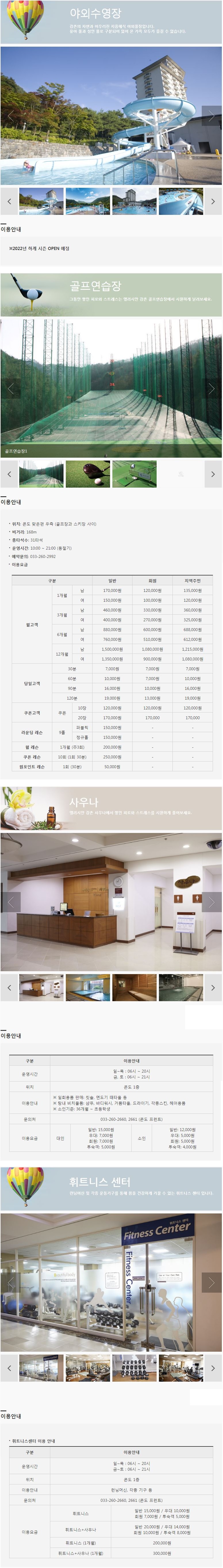 부대시설 : 스키장, 골프장, 실외수영장, 사우나, 휘트니스센터, 골프연습장 등