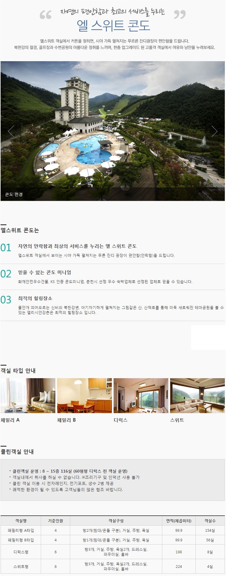 객실안내 : 패밀리A,B(30평형-210객실), 디럭스(60평형-8객실), 스위트(68평형-4객실)