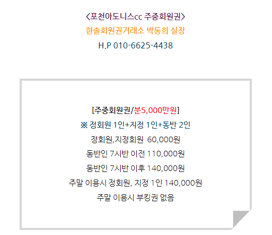 골프회원권/포천아도니스 포천아도니스cc회원권 매매 안내드립니다. 한솔회원권거래소 작성함 2022. 3. 22. 14:28 페이스북에 공유 카카오스토리에 공유 네이버에 공유 트위터에 공유 구글플러스에 공유 + 안녕하세요. 한솔회원권거래소 박동희 실장입니다. 오늘은 포천아도니스cc회원권에 대해서 알아보도록 하겠습니다. 매매상담 - 한솔회원권거래소박동희 실장 010.6625.4438 포천아도니스cc회원권은 주중회원권으로 정회원 1인과 지정회원 1인, 동반인 2인 입회로 구성되어 있습니다. 더욱 궁금하신 부분은 한솔회원권으로 문의하여 주시기 바랍니다. ▼▼▼ 포천아도니스cc 이용요금 포천아도니스cc 오시는 길 골프/콘도/휘트니스 회원권 한솔회원권거래소 빠른상담을 원하신다면 아래의 이미지를 클릭하여 주시기 바랍니다. ▼▼▼ 공유하기 게시글 관리 한솔회원권거래소 저작자표시 (새창열림) '골프회원권/포천아도니스' 다른 게시물 보기 더보기 2022.06.27 포천아도니스cc회원권 매매 안내드립니다. 2021.01.13 포천아도니스cc회원권 혜택과 정보 안내 2020.12.14 포천아도니스cc회원권 혜택과 정보 안내 2018.04.10 포천아도니스cc회원권 가격 (시세,매매)