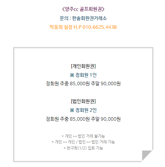 골프회원권/양주 양주cc회원권 매매 안내드립니다. 한솔회원권거래소 작성함 2022. 3. 29. 13:53 페이스북에 공유 카카오스토리에 공유 네이버에 공유 트위터에 공유 구글플러스에 공유 + 안녕하세요. 한솔회원권거래소 박동희 실장입니다. 오늘은 양주cc회원권에 대해서 알아보도록 하겠습니다. 매매상담 - 한솔회원권거래소 박동희 실장 010.6625.4438 양주cc회원권은 개인회원권과 법인회원권으로 구분되어 있습니다. 회원권의 종류에 따라서 시세 및 혜택이 달라지기 때문에 더욱 궁금하신 부분이 있다면 한솔회원권으로 문의 부탁드립니다. ▼▼▼ 양주cc 이용요금 및 예약안내 양주cc 오시는 길 골프/콘도/휘트니스 회원권 한솔회원권거래소 빠른상담을 원하신다면 아래의 이미지를 클릭하여 주시기 바랍니다. ▼▼▼ 공유하기 게시글 관리 한솔회원권거래소 저작자표시 (새창열림) '골프회원권/양주' 다른 게시물 보기 더보기 2022.05.25 양주cc회원권 매매 안내드립니다. 2022.05.02 양주cc회원권 매매 안내드립니다. 2022.02.15 양주cc회원권 매매 안내드립니다. 2022.01.07 양주cc회원권 매매 안내드립니다.