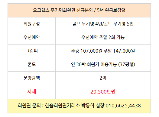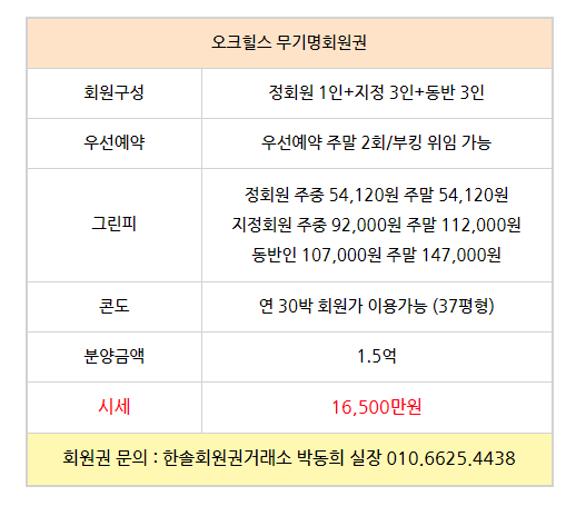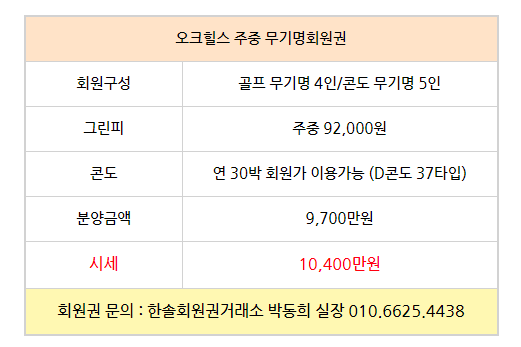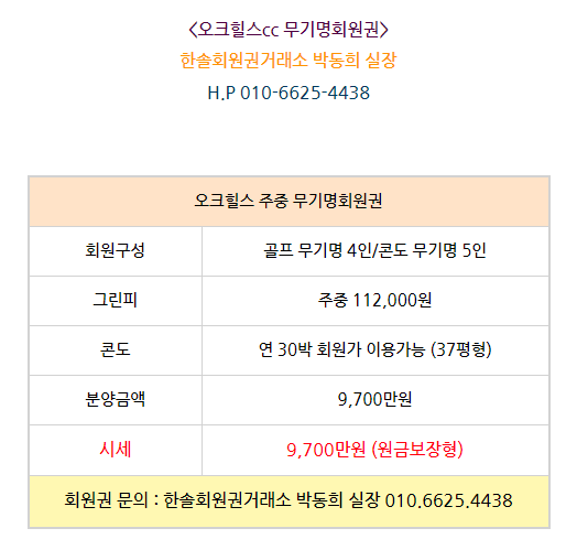 골프회원권/오크힐스 오크힐스cc회원권 매매 안내드립니다. 한솔회원권거래소 작성함 2022. 3. 31. 13:35 페이스북에 공유 카카오스토리에 공유 네이버에 공유 트위터에 공유 구글플러스에 공유 + 안녕하세요. 한솔회원권거래소 박동희 실장입니다. 오늘은 오크힐스cc회원권에 대해서 알아보도록 하겠습니다. 매매상담 - 한솔회원권거래소 박동희 실장 010.6625.4438 한림광릉cc회원권은 무기명회원권으로 분양금액에 따라서 시세 및 혜택이 달리지기 때문에 더욱 궁금하신 부분이 있다면 언제든지 한솔회원권 박동희 실장으로 문의하여 주시기 바랍니다^^ ▼▼▼ 오크힐스cc 이용요금 및 예약안내 오크힐스cc 오시는 길 골프/콘도/휘트니스 회원권 한솔회원권거래소 빠른상담을 원하신다면 아래의 이미지를 클릭하여 주시기 바랍니다. ▼▼▼ 공유하기 게시글 관리 한솔회원권거래소 저작자표시 (새창열림) '골프회원권/오크힐스' 다른 게시물 보기 더보기 2022.03.23 오크힐스cc회원권 매매 안내드립니다. 2021.11.08 오크힐스cc회원권 안내 2021.10.27 2021.10.27 오크힐스cc무기명회원권 매매안내 2021.09.14 HDC 오크힐스cc 주중특별 동반무기명회원권 추천매물 매매시세 (2021.09.14.) 안내 _ 오크힐스주중 오크힐스주중무기명