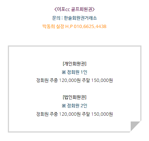 골프회원권/이포 이포cc회원권 매매 안내드립니다. 한솔회원권거래소 작성함 2022. 4. 7. 09:24 페이스북에 공유 카카오스토리에 공유 네이버에 공유 트위터에 공유 구글플러스에 공유 + 안녕하세요. 한솔회원권거래소 입니다. 오늘은 이포cc회원권에 대해서 알아보도록 하겠습니다. 매매상담 - 한솔회원권거래소 010.6625.4438 이포cc는 개인회원권과 법인회원권으로 구분되어 있습니다. 회원권에 대해서 더욱 궁금하신 부분이 있다면 한솔회원권으로 문의하여 주시기 바랍니다. ▼▼▼ 이포cc 이용요금 및 예약 안내 이포cc 오시는 길 골프/콘도/휘트니스 회원권 한솔회원권거래소 빠른상담을 원하신다면 아래의 이미지를 클릭하여 주시기 바랍니다. ▼▼▼ 공유하기 게시글 관리 한솔회원권거래소 저작자표시 (새창열림) '골프회원권/이포' 다른 게시물 보기 더보기 2022.06.28 이포cc회원권 매매 안내드립니다. 2022.05.26 이포cc회원권 매매 안내드립니다. 2022.02.17 이포cc회원권 매매 안내 드립니다. 2022.01.24 이포cc회원권 매매 안내드립니다.