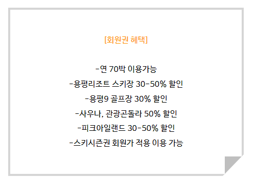 용평리조트 스키장 30~50% 할인, 용평9골프장 30% 할인, 사우나, 관광