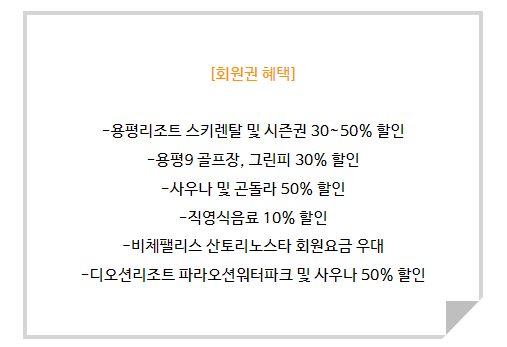 살펴보자면 용평리조트 스키렌탈 및 시즌권 30~50% 할인, 용평9 골프장,