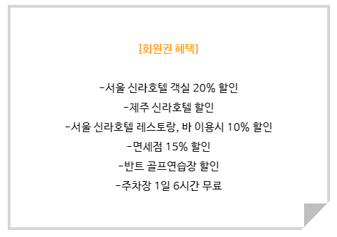 혜택을 살펴보자면 서울 신라호텔 객실 20% 할인, 제주 신라호텔 할인,
