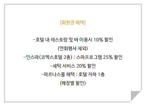 스파프로그램 25% 할인, 세탁 서비스 20% 할인, 파르나스몰 호텔