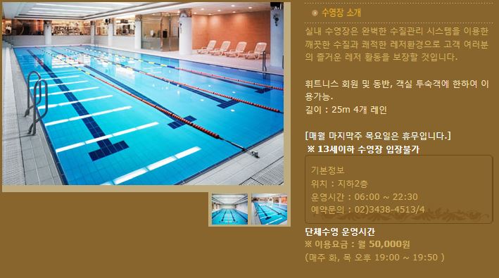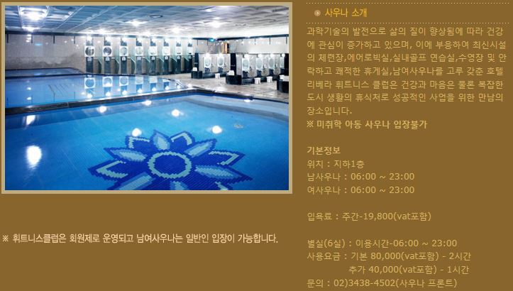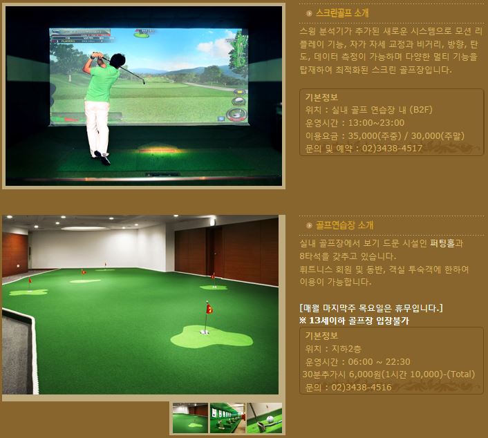 - 주요시설 : 체련장, 사우나, 수영장, 골프 연습장 등