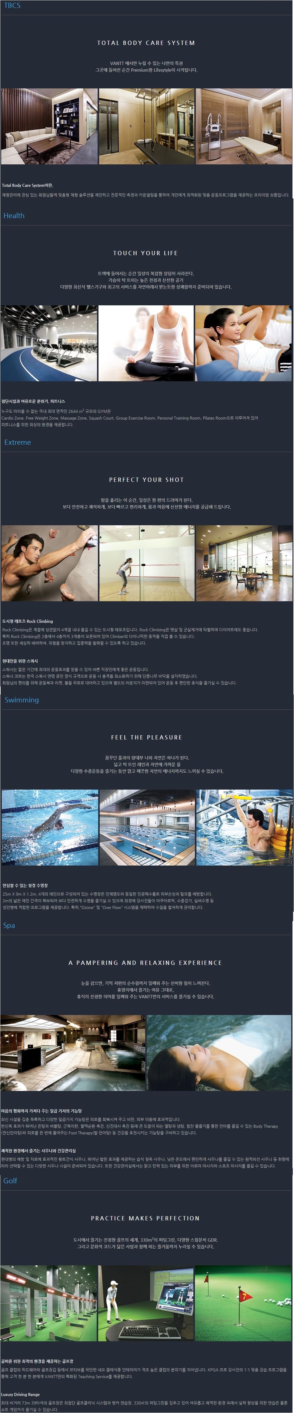 휘트니스 시설 : 체련장, 실내 수영장, 골프 연습장 등