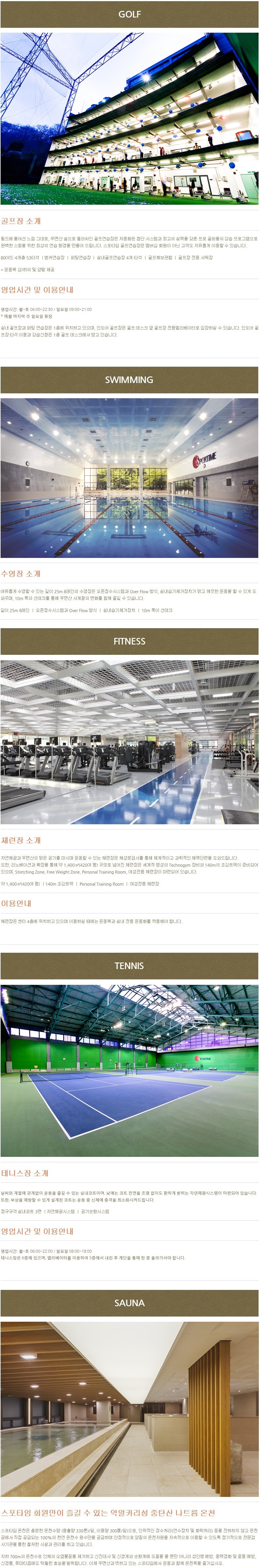 휘트니스 시설 : 골프장, 체련장, 실내 수영장, 테니스, 온천, 사우나 등