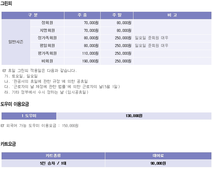 - 가족회원/준회원 그린피 : 정가족회원대우 (주중8만원/주말25만원)