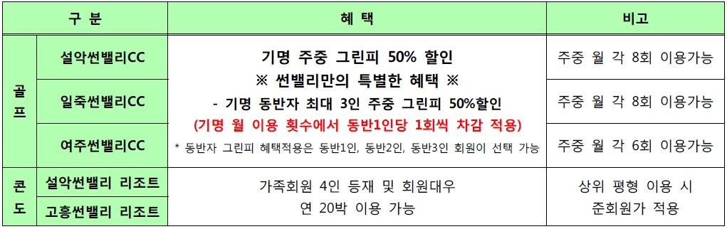 - 설악썬밸리cc : 기명회원 및 동반인 (최대3인) 주중그린피 50%할인